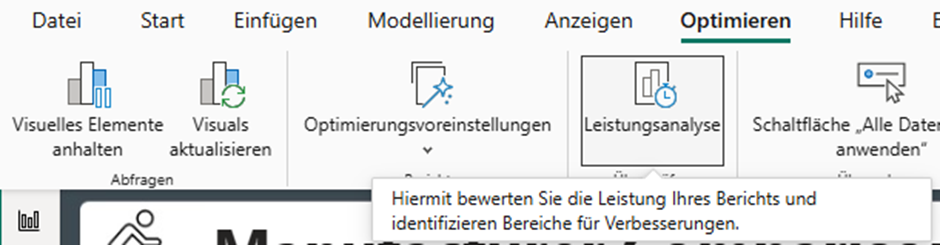 Dafür wenden wir zuerst die Leistungsanalyse in Power BI an. Diese ist unter “Optimieren” zu finden.