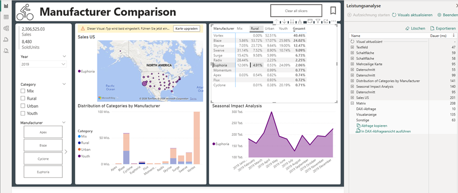 Nach dem Wählen einer Reportseite können wir „Visuals aktualisieren“ anklicken und damit Bottlenecks identifizieren.