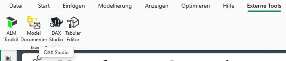Durch Klicken auf “Abfrage kopieren” können wir diese Abfrage in DAX Studio verwenden. Nach Installation können wir dieses direkt unter “Externe Tools” in Power BI aufrufen: