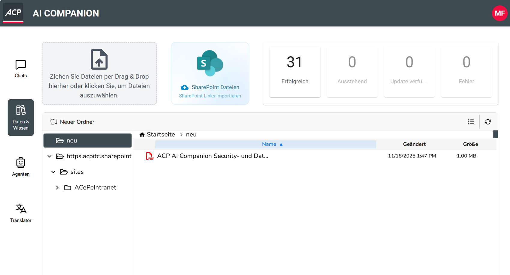 Der ACP AI Companion bietet zwei Wege, Dokumente in KI‑Prozesse einzubinden – entweder kurzfristig über den Chat oder langfristig in einer vektorisierten Datenbank.